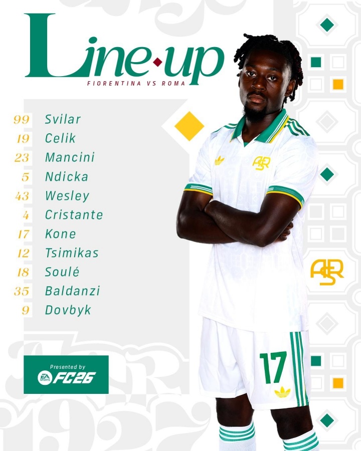 而罗马的首发阵容则充满了激情与力量:守门员斯维拉尔在球场上的表现备受期待,后防线由切利克、曼奇尼、巴尔丹齐和恩迪卡四名球员把守,力求精准防守,确保不失球。韦斯利、齐米卡斯、克里斯坦特和科内组成中场,为进攻提供支持,而锋线的苏莱与多夫比克则希望在比赛中有所建树,助力球队争取更多进球。