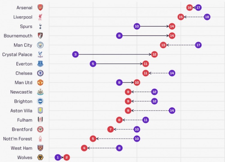 英超球隊本賽季成績出奇的懸殊 水晶宮竟然比阿森納和利物浦更有出息